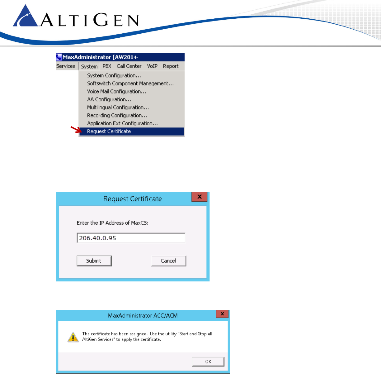The system requests that a certificate be assigned from AltiGen. You should see a confirmation message.