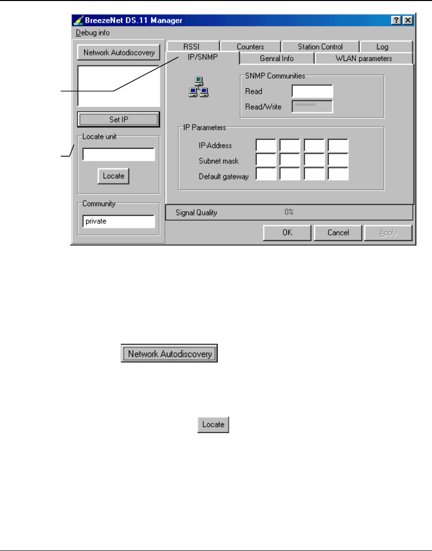 Figure 4-1. BreezeCOM Manager Main Window (IP/SNMP Tab)