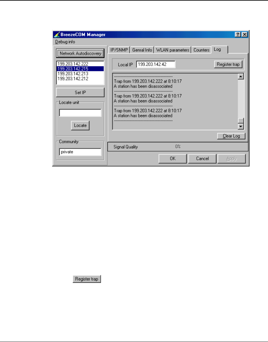 A list of the last traps is displayed in the event log area, below the Local IP field.