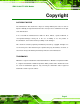 IEM-LX-800 ETX CPU Module Copyright COPYRIGHT NOTICE The information in this document is subject to change without prior notice in order to improve reliability, design and function and does not represent a commitment on the part of the manufacturer. In no event will the manufacturer be liable for direct, indirect, special, incidental, or consequential damages arising out of the use or inability to use the product or documentation, even if advised of the possibility of such damages.