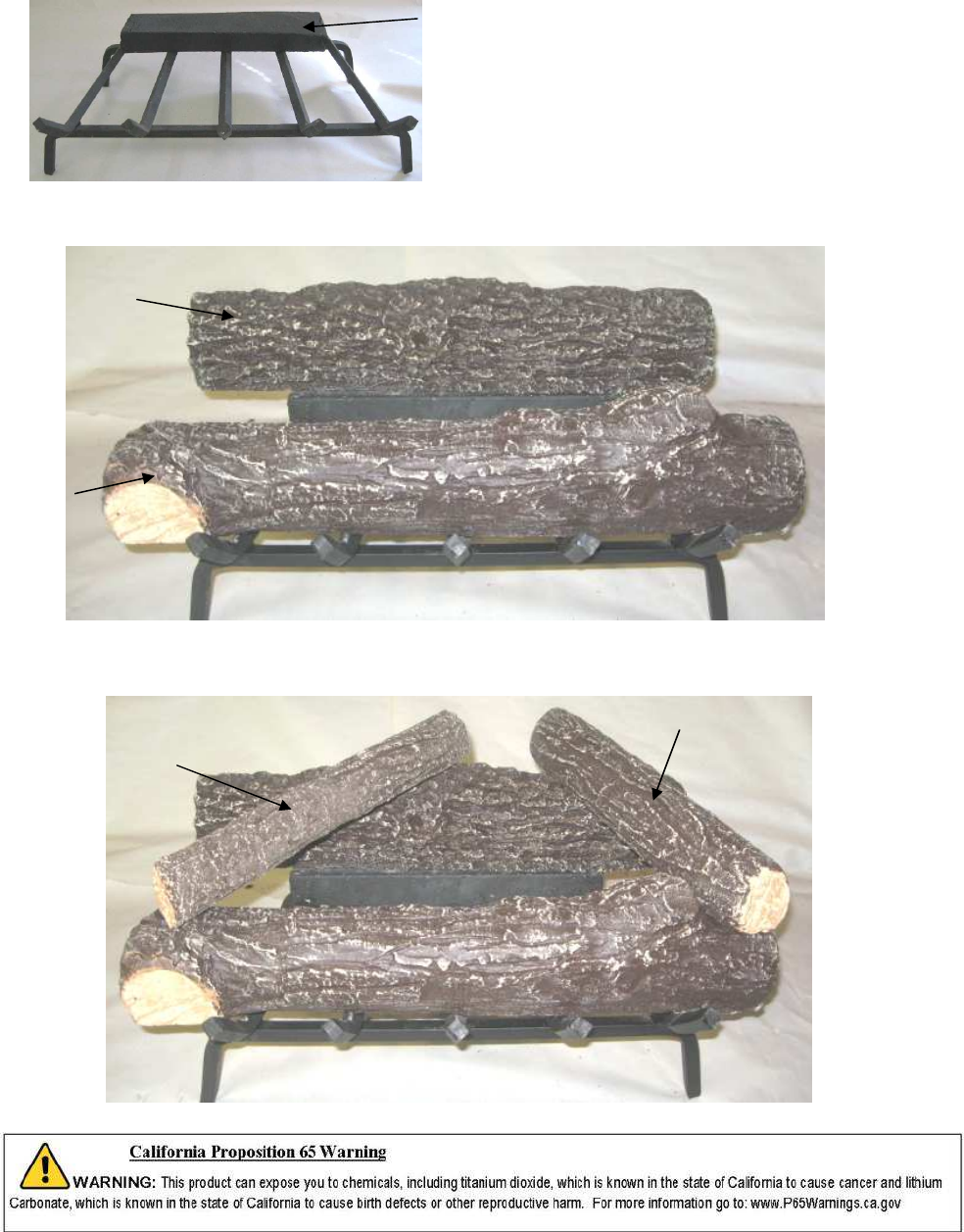 DUNDEE OAK 24” Place the brick riser A-0305 on the grate at the back. A-0305 Place the back log on top of the brick riser. Place the front log H-0961A. 4-UB2 H-0961A Place logs H-0965A & H-0964A..