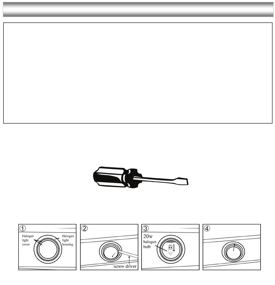 • This range hood uses halogen bulbs: 20W 12V type G4.