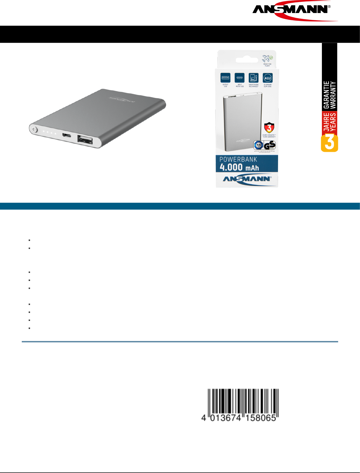 Delivery includes: Powerbank 4 Ah, silver coloured, micro-USB cable, operating instructions