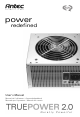 Antec TruePower 2.0 User's Manual ATX12V version 2.0 power supply Models: TPII-380, TPII-430, TPII-480, TPII-550, TPII-480Blue, TrueControl II-550 TruePower 2.0 series power supplies comply with the newest ATX12V version 2.0 specifications. This includes dual 12V output circuitry that delivers safer and more reliable output to your system's components, as well as higher energy efficiency, which reduces power consumption by up to 25%, saving you money on your electricity bill.