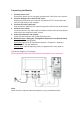 Connecting the Monitor Connection Diagram (For example) (Please be advised that some illustrations are simulated for your reference) Note: Audio function is optional feature,its depend on your purchased monitor. English 1. Connect power cord Connect the power cord to a properly grounded AC outlet, then to the monitor. 2. Connect Analog video cable (D-Sub cable) Make sure both monitor and computer are powered OFF. Connect the video cable (D-Sub cable) to the computer. 3.