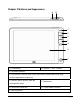 Chapter 2 Buttons and Appearance A B C D E F G H I A. Power button B. Volume “+” and “-” buttons C. Operation indicator D. Home button: Press to return to the main interface; press and hold to bring out the 8 applications recently run. E. M button (Menu button): Open the F. Back button corresponding menu. G. Built-in MIC Recording H. Touch screen (“Screen”) I.
