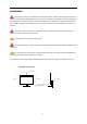 Installation Do not place the monitor on an unstable cart, stand, tripod, bracket, or table. If the monitor falls, it can injure a person and cause serious damage to this product. Use only a cart, stand, tripod, bracket, or table recommended by the manufacturer or sold with this product. Follow the manufacturer’s instructions when installing the product and use mounting accessories recommended by the manufacturer. A product and cart combination should be moved with care.