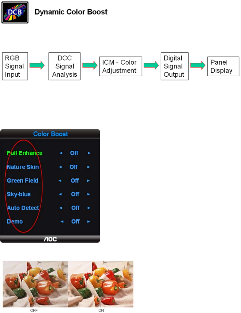 Dynamic Color Boost (DCB) is an advanced color adjustment technology. Through analyzing RGB signals, DCB creates