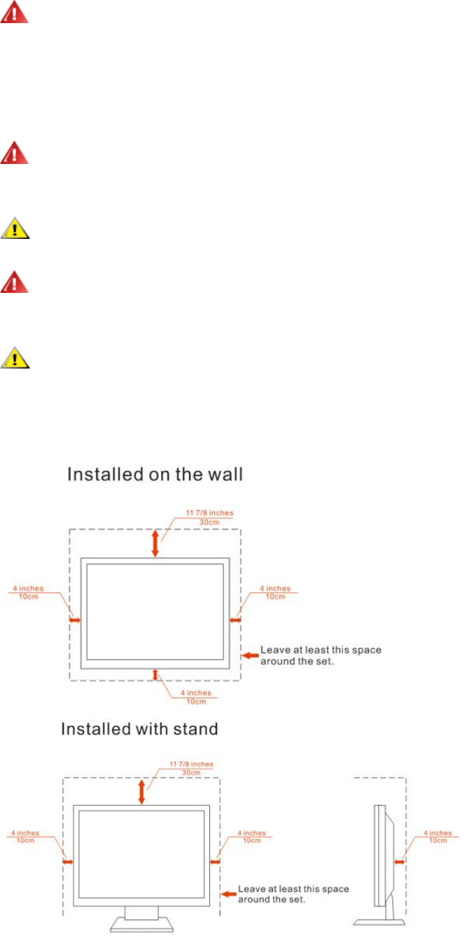 See below the recommended ventilation areas around the monitor when the monitor is installed on the wall or on