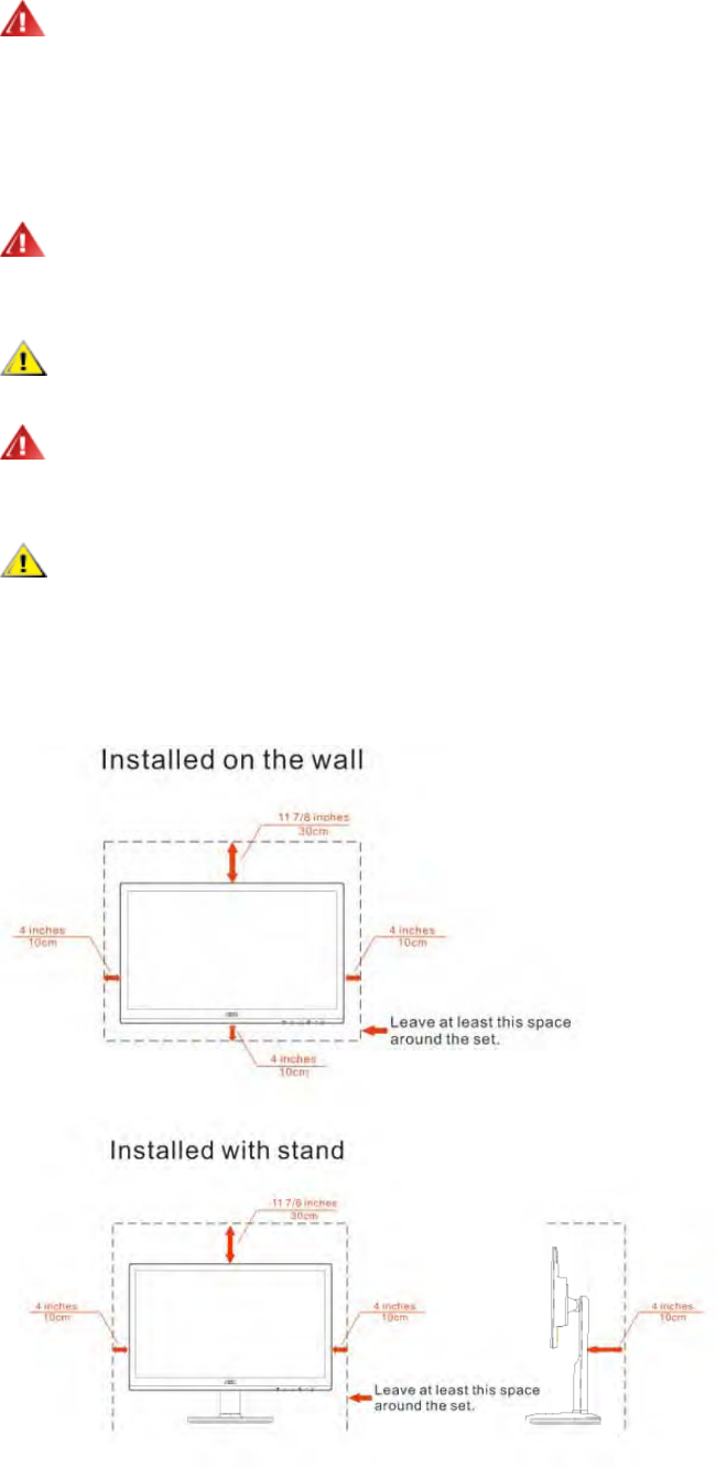 See below the recommended ventilation areas around the monitor when the monitor is installed on the wall or on