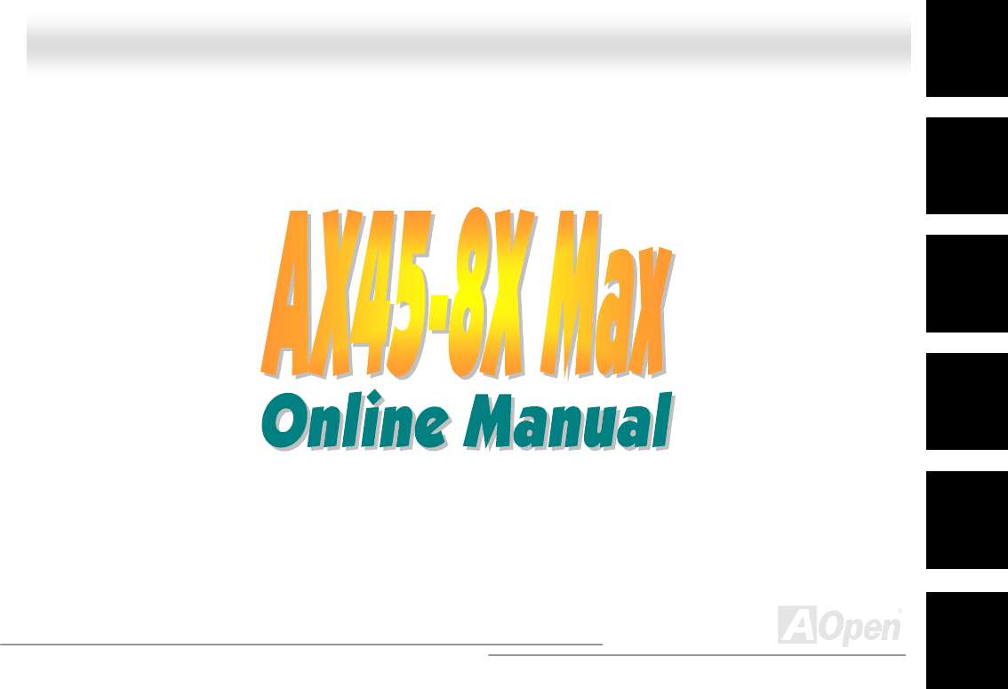 AX45-8X Max Online Manual Before You Start This Online Manual will introduce to the user how this product is installed. All useful information will be described in later chapters. Please keep this manual carefully for future upgrades or system configuration changes. This Online Manual is saved in PDF format, we recommend using Adobe Acrobat Reader 4.0 for online viewing, it is included in Bonus CD or you can get free download from Adobe web site.