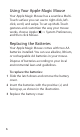 Battery Level Indicator To check the battery level, choose Apple (K) > System Preferences, and then click Mouse. The battery level indicator is in the lower-left corner. Note: When you aren’t using you mouse, it goes to sleep to conserve battery power. If you won’t be using your mouse for an extended period, turn it off. Cleaning To clean the outside of your mouse, use a lintfree cloth that’s been lightly moistened with water.