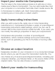 Import your media into Compressor The first step in the transcoding process is to add one or more media source files to Compressor. You can add media files from your computer or a connected hard disk. Each media source file in Compressor is called a job. Each transcoding session, containing one or more jobs, is called a batch. Apply transcoding instructions After you add a source file, apply one or more transcoding instructions to it.