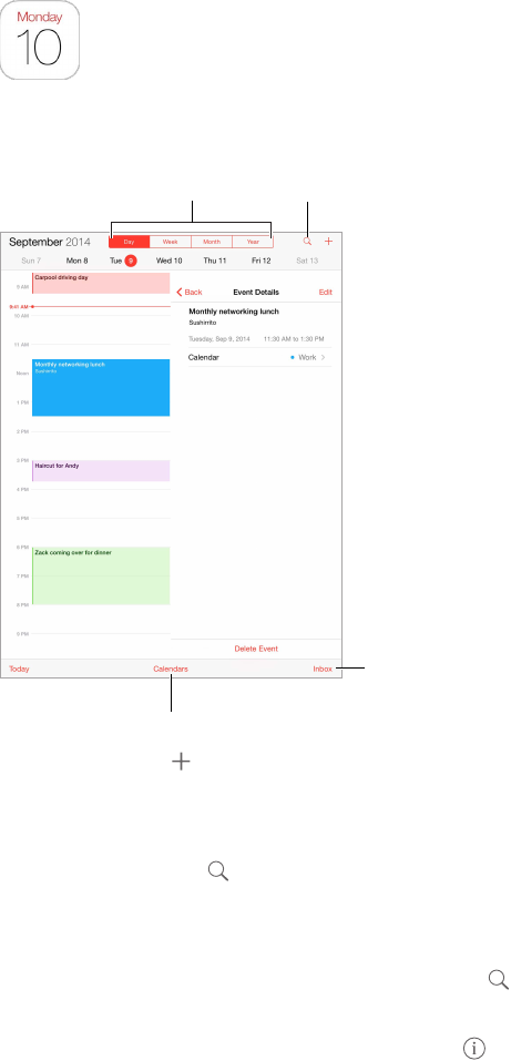 Search for events. Tap , then enter text in the search eld. The titles, invitees, locations, and