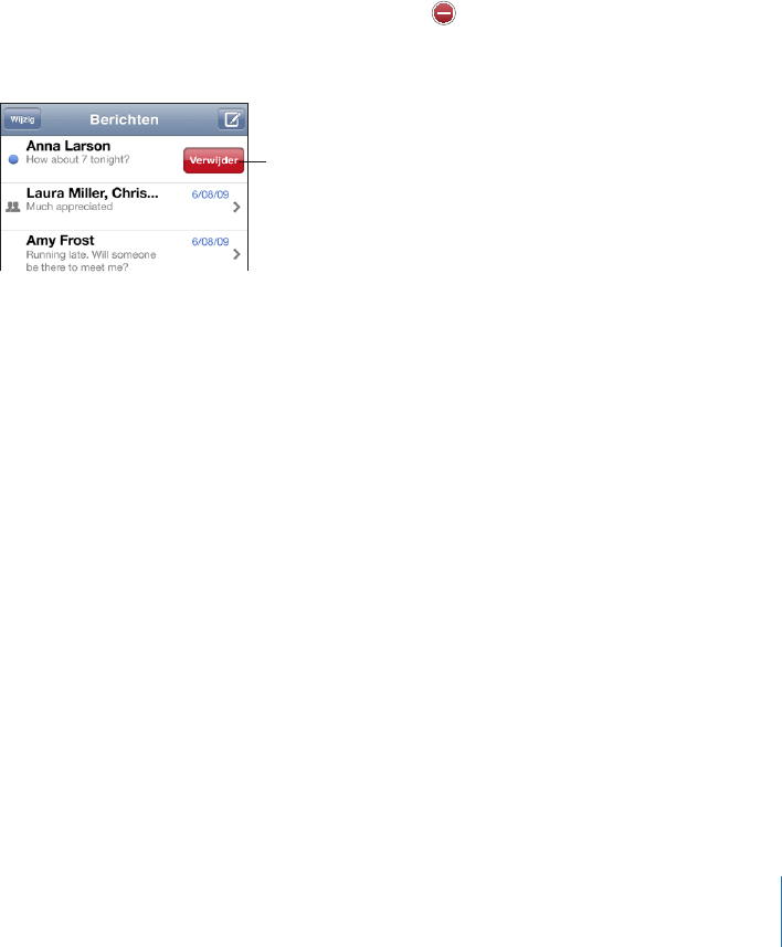 Een gesprek verwijderen: Tik op 'Wijzig', tik op naast het gesprek en tik vervolgens
