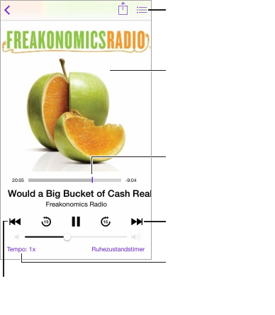 Über die Bedienelemente für die Wiedergabe können Sie in einem Podcast nach vorne bzw. nach