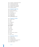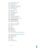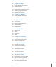 12-hour time 163 24-hour time 163 480p format 145 720p format 64, 79, 145 A accessibility features 190 Large Text 204 Mono Audio 205 setting up iPod touch using VoiceOver 18 settings 166 Speak Auto-text 205 Triple-click Home 206 VoiceOver 191 White on Black 205 Zoom 203 accounts about 20 Google, Yahoo!, and AOL 22 Microsoft Exchange 21 MobileMe 20 “push” 44, 171 restricting 162 settings 170 adjusting brightness 158 Adobe Photoshop Elements 48, 76 airplane mode settings 155 turning