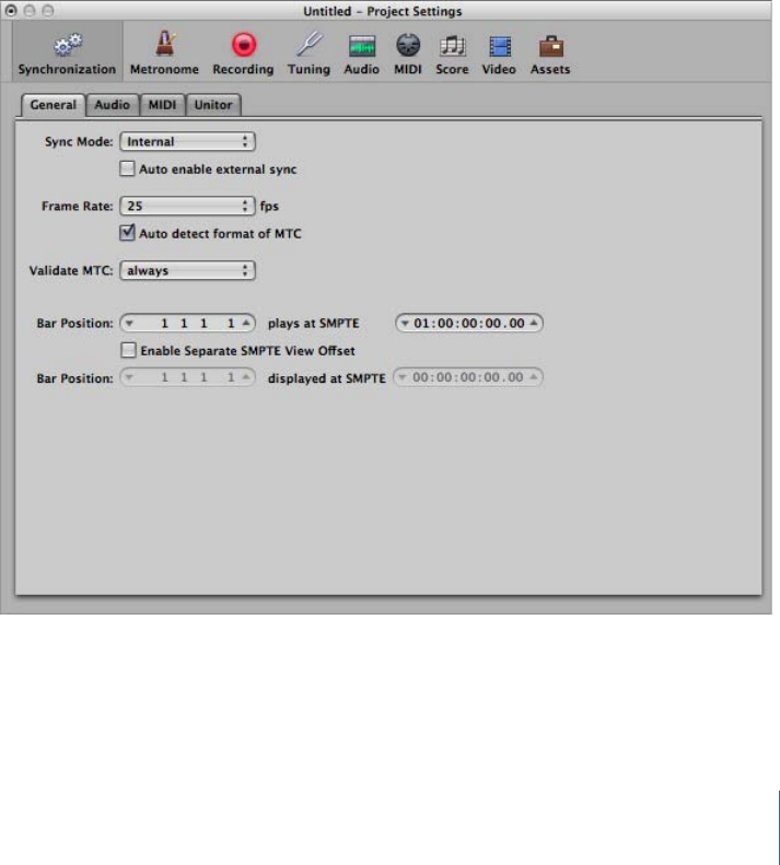 Synchronization project settings consist of the following four tabs: General, Audio, MIDI,