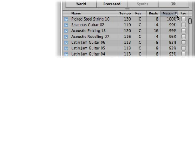• Match column: Displays Apple Loops as a percentage match between the project tempo