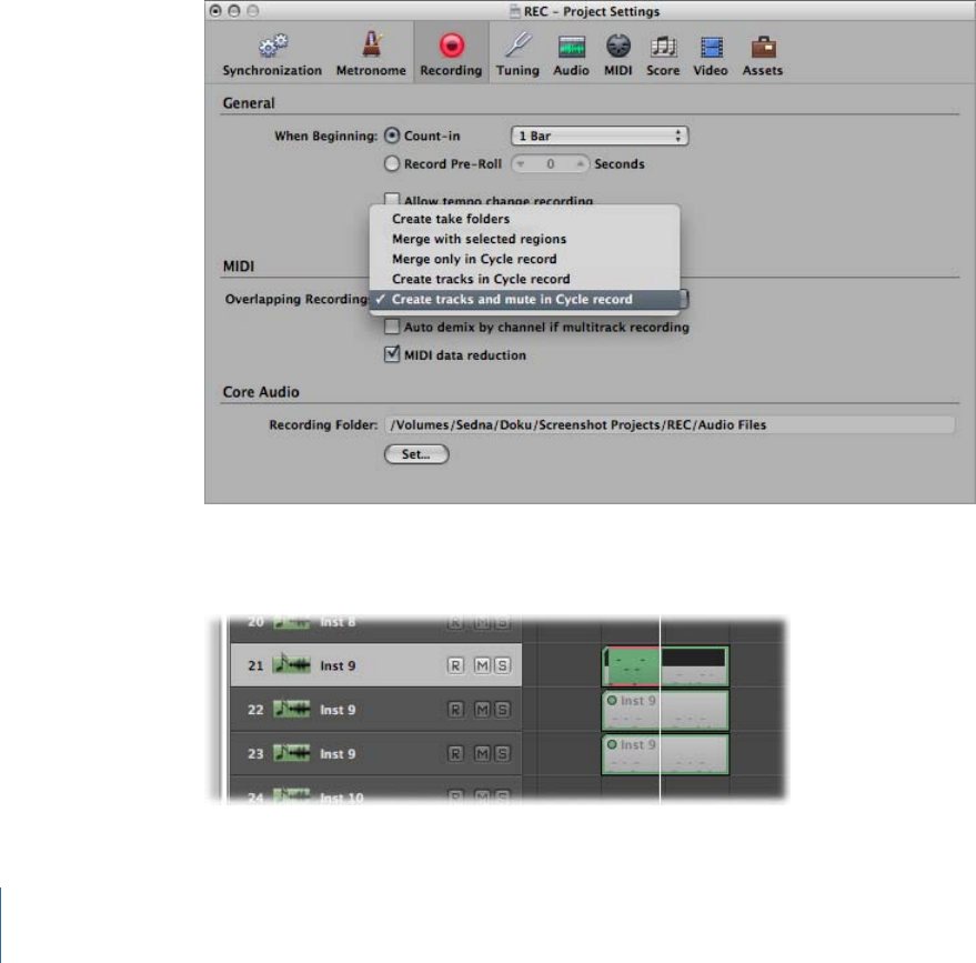 2 Open the Overlapping Recordings pop-up menu and choose “Create tracks and mute in