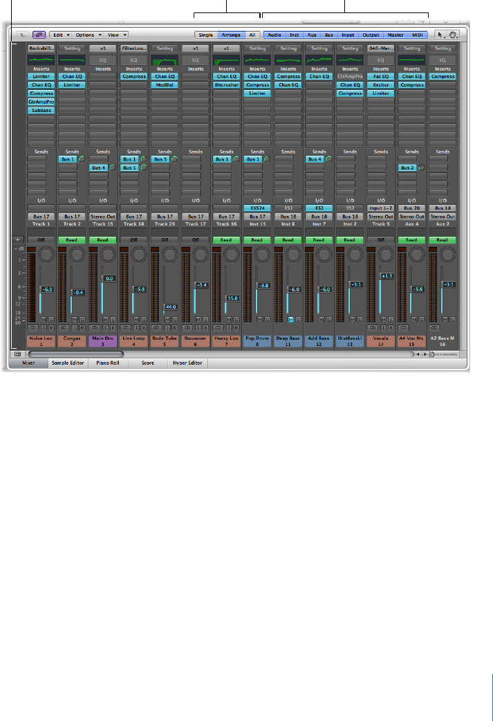 • Channel strips: Use to process audio or MIDI information that is routed from arrange