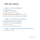Table des matières Chapitre 1 : Prêt, feu, configurez ! 10 11 21 24 25 25 Contenu de la boîte Configuration de votre Mac mini Configuration de Partage DVD ou CD Migration d’informations vers votre Mac mini Obtention d’informations supplémentaires sur votre Mac mini Mise hors tension ou suspension d’activité de votre Mac mini Chapitre 2 : Votre Mac mini au quotidien 30 32 34 36 36 Description de la face avant de votre Mac mini Description de la face arrière de votre Mac mini Utilisation de la télécommande