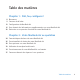 Table des matières Chapitre 1 : Prêt, feu, configurez ! 8 9 10 16 20 Bienvenue Contenu de la boîte Configuration du MacBook Air Pour obtenir des informations supplémentaires sur votre MacBook Air Extinction ou suspension d’activité de votre MacBook Air Chapitre 2 : Votre MacBook Air au quotidien 24 26 28 30 34 35 Caractéristiques de base de votre MacBook Air Fonctionnalités du clavier de votre MacBook Air Ports présents sur votre MacBook Air Utilisation du trackpad multi-touch Fonctionnement de votre Mac
