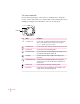 The camera mode dial Use the camera mode dial to select modes; for example, turn to Computer mode to use the camera with your computer. This section describes the modes available. See Chapter 2 for information on how to use each mode. Mode dial 4 Chapter 1 Icon Mode Description ` Computer mode Use this mode, along with the included Mac–OS based computer cable, to transfer images from the camera to your computer. (PC-Mode appears on your LCD screen.