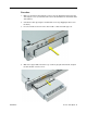 Procedure 1. Disconnect the following cables from the drive interconnect board • optical drive cable • power supply cable • locking switch cable • front panel board cable • FireWire cable 2. Release the three thumb screws that secure the drive interconnect board to the chassis. 3. Lift the board slightly to clear the two mounting pegs near both ends of the board. 4. Pull the board back, tilt it up so that the connectors clear the chassis, and remove the board from the server.