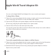 Apple World Travel Adapter Kit You can use the Apple World Travel Adapter Kit in most countries and regions. To charge iPod or iPhone: 1 Choose the correct plug adapter for the country or region you’re in (see the illustrations on the next page), and connect it to the included power adapter. 2 Connect the USB cable to the power adapter, extend the electrical prongs (if necessary), and plug the power adapter into a power outlet. 3 Connect iPod or iPhone to the other end of the cable.