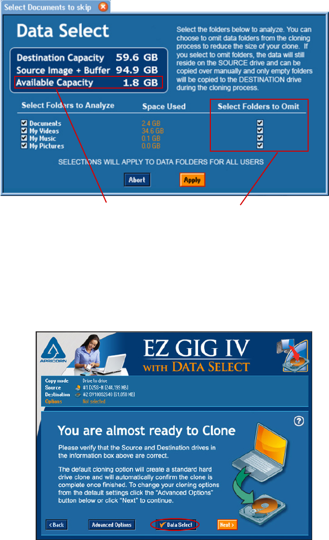 ready to Clone” screen. The Data Select button will have a check mark to the