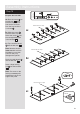 Assembly Instructions Prepare the left side a: Place 6 runners H on the left side 1 . Slide back the top of runner and use the 2nd hole from the front to fit the 1st screw F . b: Slide the runner H back the other way and fit the 2nd screw F into the corresponding hole in the left side 1 . F Finished front edge Step 15 H F F Finished front edge F a: H F H F H F H 1 H H c: Tap a wooden dowel .A into the left side 1 .
