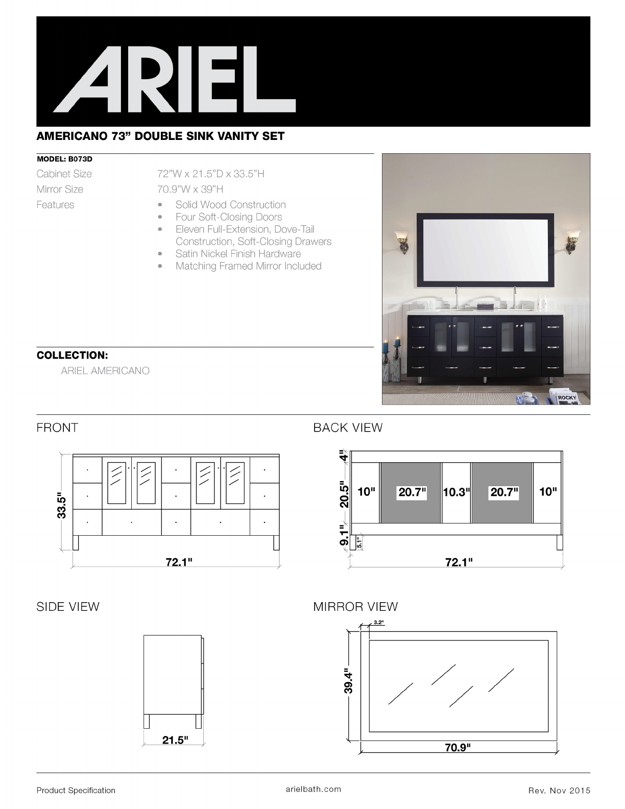 ARIEL AMERICAN 73” DOUBLE SINK VANITY SET MODEL; BOBSLED COLLECTION: FRONT “ihe 72.1" SIDE VIEW 21.5" BACK VIEW ¥ Bl ov 10.34 20.7" 72.4" MIRROR VIEW p22 70.5" Peugeot Aspiration variegate. com Rew.
