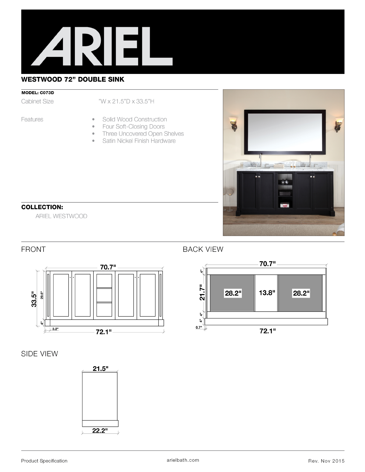 Ariel Westwood 72" Double Floor Standing Wood Vanity Cabinet Only - Less Vanity Top