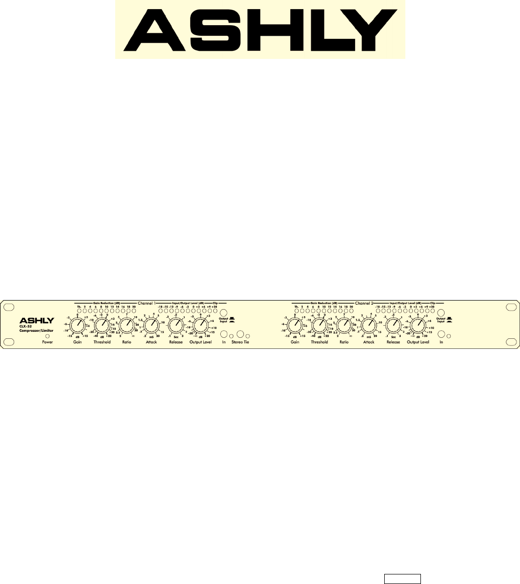 CLX-52 Compressor/Limiter Operating Manual Ashly Audio Inc. 847 Holt Road, Webster, NY 14580-9103 Toll Free (800) 828-6308, Telephone (585) 872-0010, FAX (585) 872-0739 www.ashly.com All Trademarks referred to herein, are the property of their respective owners.