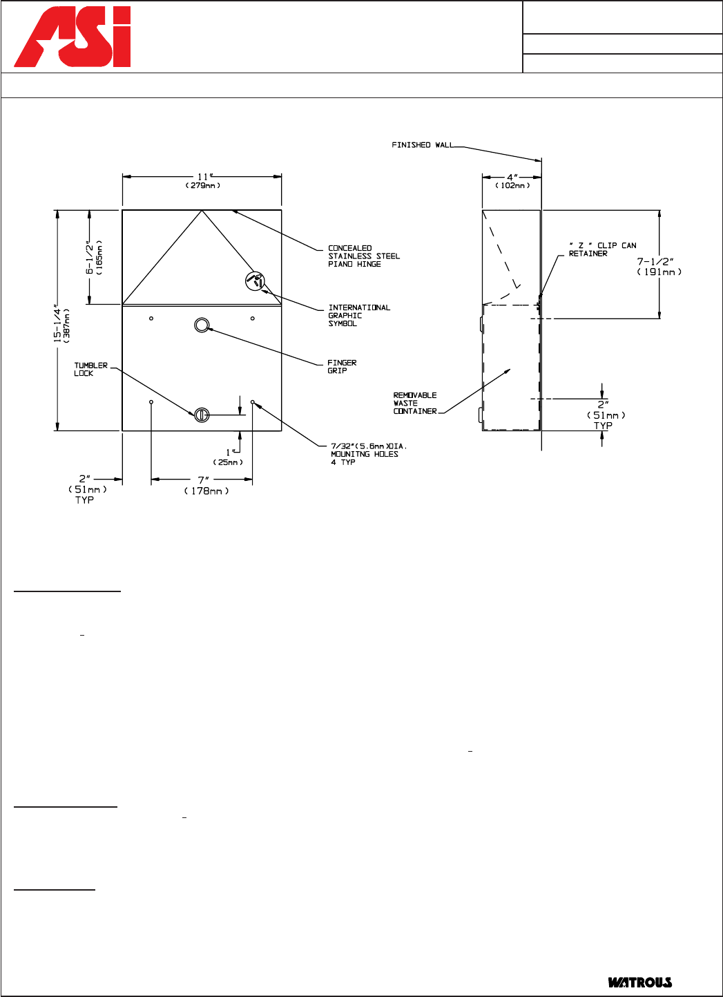 by full width Z-retainer and shall be held closed with a tumbler lock keyed alike to other ASI washroom equipment. Waste container