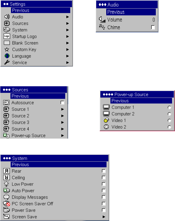 Audio: allows adjustments to the volume and balance, and turns the projec-