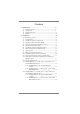 Contents 1. Introduction................................................................. 5 1.1 1.2 1.3 1.4 Package Contents ..................................................................... Specifications............................................................................. Motherboard Layout ................................................................. I/O Panel .................................................................................. 5 6 12 13 2. Installation ..................