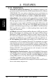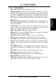 2. FEATURES 2.1.2 Connections • • • • • • • • • • • • • • • CPU socket: Socket A (462) for AMD® processors. PCI Expansion Slots: Provides five 32-bit Legacy Free PCI slots, (PCI 2.2 compliant) eliminating bottlenecks and system memory management issues. All PCI slots can support Bus Master PCI cards, such as SCSI or LAN cards. (PCI supports up to 133MB/s maximum throughput.) The MB supports Concurrent PCI, which allows multiple PCI transfers from PCI master bus to the memory and processor.
