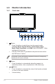 1.3.2 Back view 1 2 3 4 5 6 7 Rear connectors 1. Kensington lock slot. 2. AC-IN port: This port connects the power cord. 3. HDMI-IN port: This port is for connection with an HDMI compatible device (support NVIDIA® 3D Vision™ and Blu-ray 3D). 4. DVI port: This 24-pin port is for PC (Personal Computer) DVI-D digital signal connection (support NVIDIA® 3D Vision™). The 3D feature is only supported through HDMI-IN and DVI port. 1-4 5. VGA port: This 15-pin port is for PC VGA connection. 6.