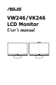 1. Product introduction 1.1 Welcome! Thank you for purchasing the ASUS® VW246/VK246 LCD monitor! The latest widescreen LCD monitor from ASUS provides a crisper, broader, and brighter display, plus a host of features that enhance your viewing experience. Besides, VK246 provides the built-in 1.3 mega-pixel webcam, which enhances image quality.