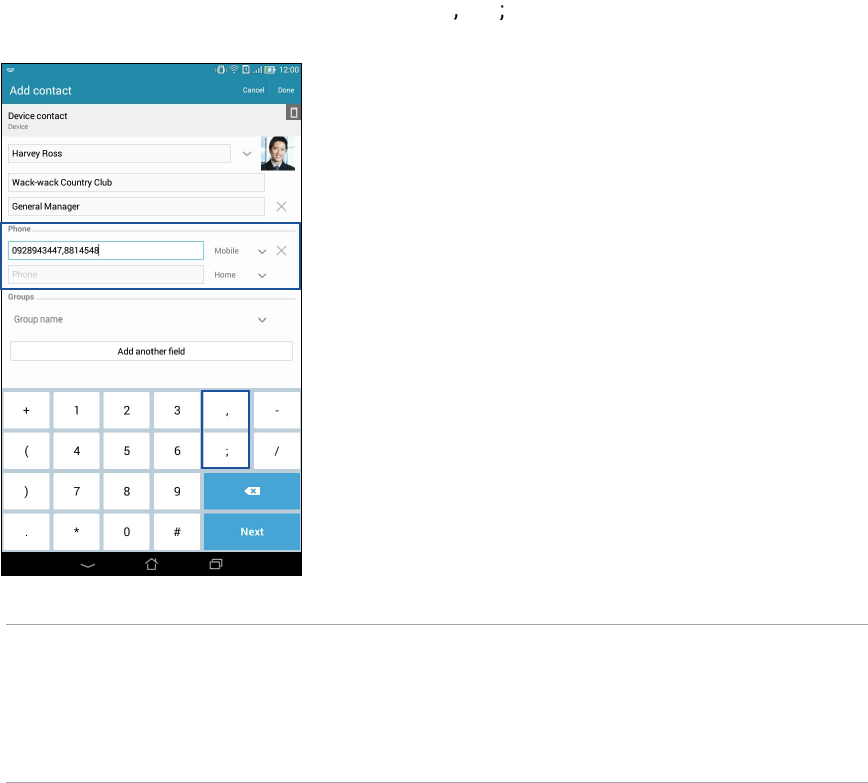 2. On the Phone eld, key in the main line then tap or , and add the extension number.