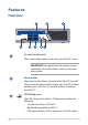 Features Front view Air vents (intake vent) The air vents allow cooler air to enter your Mini PC chassis. IMPORTANT! For optimal heat dissipation and air ventilation, ensure that the air vents are free from obstructions. Power button The power button allows you to turn the Mini PC on or off. You can use the power button to put your Mini PC to sleep mode or press it for four (4) seconds to force shutdown your Mini PC.