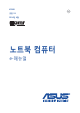 이 설명서 소개 이 설명서는 노트북 컴퓨터의 하드웨어 및 소프트웨어에 관한 정보를 제공하며 다음과 같은 장으로 구성되었습니다. 1장: 하드웨어 설치 이 장에서는 노트북 컴퓨터의 하드웨어 구성요소를 자세히 설명합니다. 2장: 노트북 컴퓨터 사용법 이 장에서는 노트북 컴퓨터의 각기 다른 부분들을 사용하는 방법을 알려줍니다. 3장: Windows® 8.1에서 작업하기 이 장에서는 노트북 컴퓨터에서 Windows® 8.1을 사용하는 방법을 개괄합니다. 4장: 전원 자체 테스트(POST) 이 장에서는 POST를 사용하여 노트북 컴퓨터의 설정을 변경하는 방법을 알려줍니다. 팁 및 자주 묻는 질문 이 절에서는 노트북 킹퓨터에서 일반적인 문제를 유지보수하거나 해결할 때 참조할 수 있는 참조할 수 있는 몇 가지 권장 팁, 하드웨어 및 소프트웨어 FAQ를 제시합니다. 부록 이 절에는 노트북 컴퓨터의 주의사항과 안전지침이 들어 있습니다.