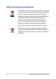 Zasady bezpieczeństwa Używanie notebooka Ten komputer może być używany wyłącznie w miejscach, gdzie temperatura otoczenia mieści się pomiędzy 5°C (41°F) a 35°C (95°F). Sprawdź etykietę wartości znamionowych w dolnej części komputera i upewnij się, że adapter zasilania może zapewnić wymagane zasilanie. Nie należy umieszczać notebooka na kolanach lub w pobliżu dowolnej części ciała, aby zapobiec dyskomfortowi, bądź obrażeniom ciała z uwagi na wystawienie na działanie ciepła.