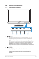 1.5 Monitor introduction 1.5.1 Front of the LCD monitor 1 1. 2 3 4 5 Button: • Automatically adjust the image to its optimized position, clock, and phase by long pressing this button for 2-4 seconds (for VGA mode only). • Use this hotkey to switch from six video preset modes (Scenery Mode, Standard Mode, Theater Mode, Game Mode, Night View Mode, and sRGB Mode) with SPLENDID™ Video Enhancement Technology. • Exit the OSD menu or go back to the previous menu as the OSD menu is active.