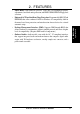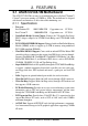 2. FEATURES • • • Smart BIOS: 2Mb firmware provides Vcore and CPU/SDRAM frequency adjustments, boot block write protection, and HD/SCSI/MO/ZIP/CD/Floppy boot selection. Enhanced ACPI and Anti-Boot Virus Protection: Programmable BIOS (Flash EEPROM) that offers enhanced ACPI for Windows 98 compatibility, built-in firmware-based virus protection, and autodetection of most devices for a virtual automatic setup.