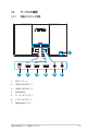 1.5 ディスプレイ各部の説明 1.5.1 コントロールボタンの使用 ディスプレイ下部のコントロールボタンを使用して、画像設定を調整します。 入力選択 クローズ メニュー 電源 電源ボタン/電源インジケータ: 1. • ディスプレイ電源のオン/オフを切り替えるにはこのボタンを押します。 • 電源インジケータの色は、下の表のように定義されています。 2. 説明 オン 黄色 スタンバイモード オフ オフ (5ウェイ)ボタン: • ディスプレイ電源をオンに切り替えるにはこのボタンを押します。 • OSDメニューをオンに切り替えます。選択したOSDメニュー項目を実行しま す。 • 値を増やす/減らすか、選択を上/下/左/右に動かします。 入力選択ボタン: 3. • 1-4 状態 白 これはホットキーです。デフォルト設定は入力選択です。入力選択ホットキ ーを使って、HDMI-1、HDMI-2、DisplayPort、Switch To DP1.1 または Switch To DP1.