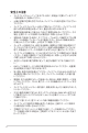通知 FCC(米国連邦通信委員会)規定の適合宣言 本装置は米国連邦通信委員会(FCC)規定第 15 部に準拠しています。本装置 の操作は以下の 2 つの条件を前提としています: • 本装置は有害な電波障害を引き起こさすとは限らないこと。 • 本装置は、誤動作を引き起こしうる電波障害を含め、いかなる電波障害も 容認しなければならないこと。 本装置は、FCC 規定第 15 部によるクラス B デジタル装置の規制に準拠する ことが試験により確認されています。 これらの規制は、住居に設置した場合の 有害な電波障害に対する適正な保護を提供することを目的としたものです。 本装置は無線周波エネルギーを生成、使用し、放射しうるため、取り扱い説明 書の記載どおりに設置、使用しない場合には、無線通信に有害な電波障害を 引き起こす可能性があります。ただし、特定の設置方法において電波障害が発 生しないという保証はありません。本装置の電源のオン / オフを切り替えるこ とにより、本装置が無線またはテレビの受信に有害な電波障害を引き起こし ていることが確認された場合は、電波障害を修正するために次の対処方法の うちいくつかをお試し