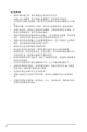 注意事項 聯邦通訊委員會 (FCC) 聲明 本裝置符合 FCC 條款第 15 部份的規定。操作程序受限於下列兩項條件: • 本裝置不得引起有害干擾。 • 本裝置須能承受任何可接收的干擾,包括可能導致意外操作的干擾。 本設備經測試符合 FCC 條款第 15 部份關於 B 類數位裝置的規定。這些限 制之主要目的乃針對在住宅區內安裝裝置時,提供有害干擾的合理保護。本 設備會產生、使用並放射無線射頻能量,如未根據製造商的指示方法安裝和 使用本設備,可能會對無線電通訊造成有害干擾。然而,我們無法保證在特 定環境下安裝此設備不會造成任何干擾。若本設備確實對無線電或電視接收 造成不良干擾(請開關設備加以確認),您可採取以下方式改善干擾情形: • 重新調整收訊天線的方向或位置。 • 將設備與接收器之間的距離加大。 • 將設備與接收器插至使用不同電路的電源插座。 • 向有經驗的無線電 電視技術人員尋求協助。 加拿大通訊部聲明 根據加拿大通訊部於無線電干擾法規中針對數位裝置產生無線電干擾所制定 的 B 類限制,本數位裝置所產生之無線電干擾並未超出上限。 本 B 類數位裝置符合加拿大 ICES-003 之規定